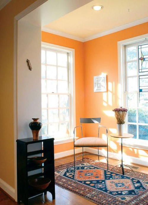 Ngôi nhà của bạn sẽ mang phong cách trẻ trung, năng động với gam màu da cam. Tuy nhiên, bạn không nên dùng màu da cam quá nhợt nhạt vì sẽ làm cho căn phòng trở nên lu mờ và không có chiều sâu. Bạn cần phải dùng tone màu da cam sặc sỡ thì sẽ thực sự làm cho căn phòng trở nên tỏa sáng. Ngoài ra, bạn có thể kết hợp với màu xanh nước biển hoặc màu xanh ngọc lam để mang lại vẻ đẹp ấn tượng cho căn phòng của bạn.